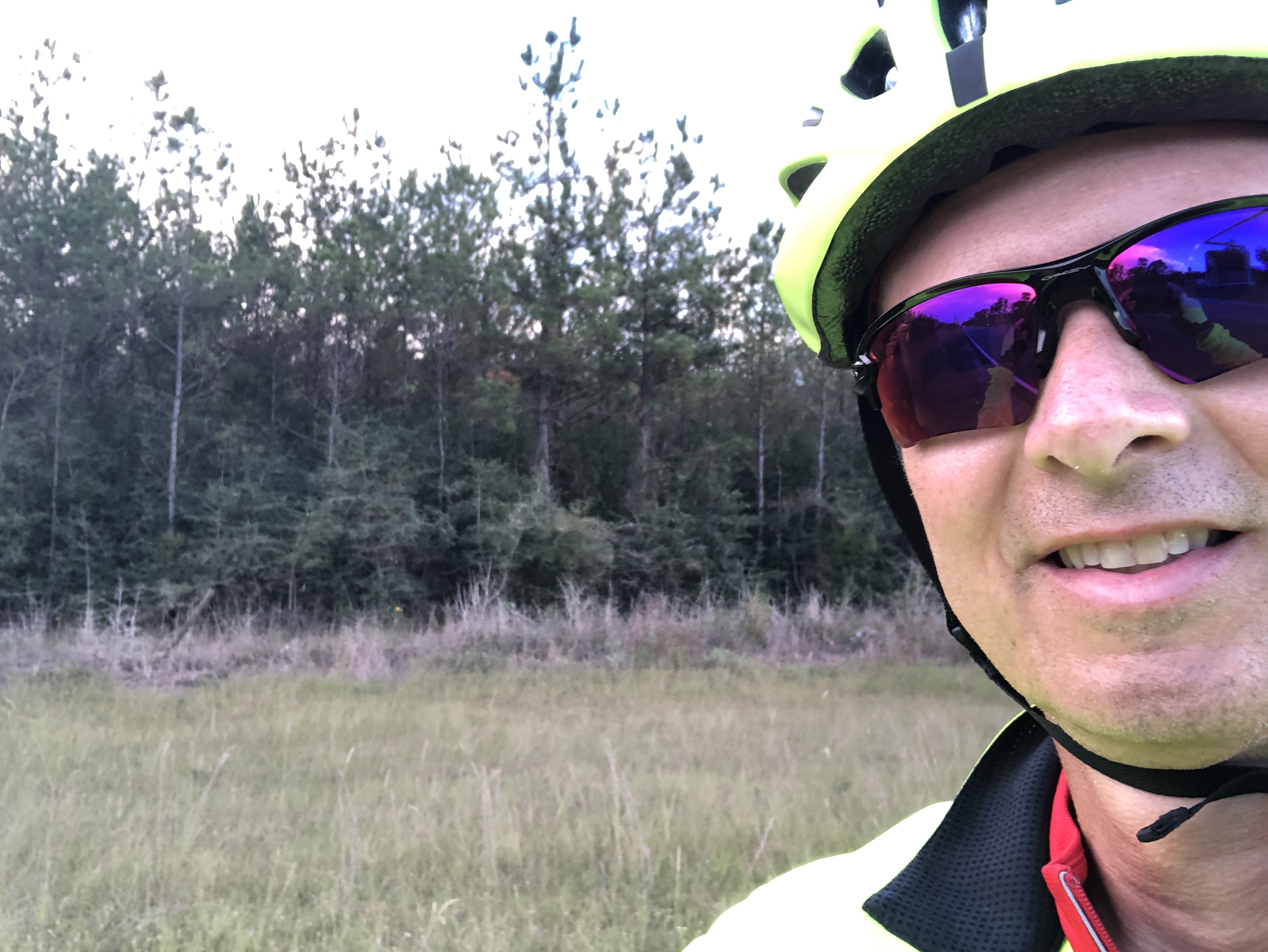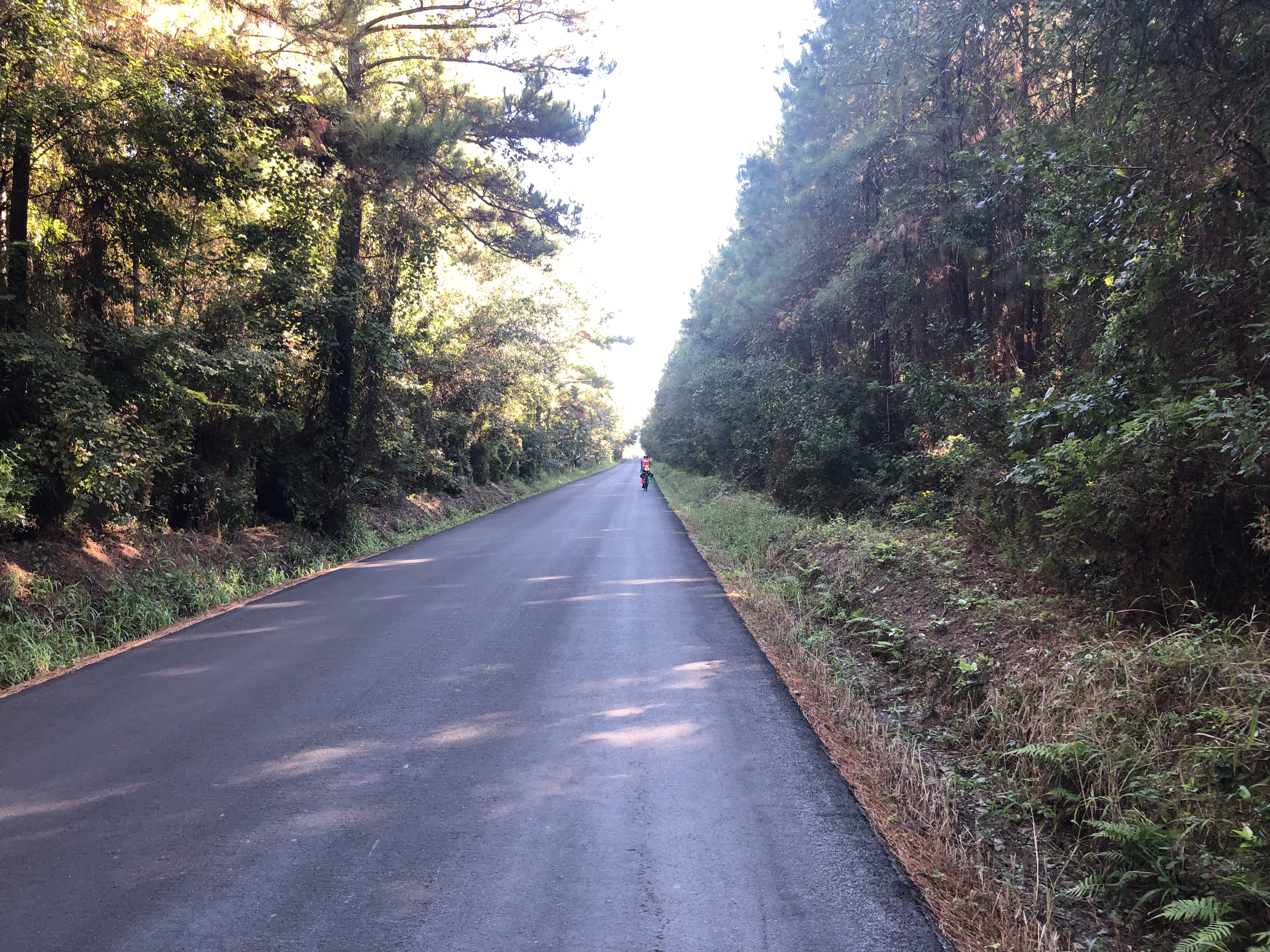 So, one of the towns we rode through was called Cut and Shoot, City Hall in backgroundFarm land with surrounding forest, landscape is much different in the thicketSmall example of thicket off road, the trees keep getting bigger as we Continue toward Louisiana Fancy entrance to county courthouse in Kountze